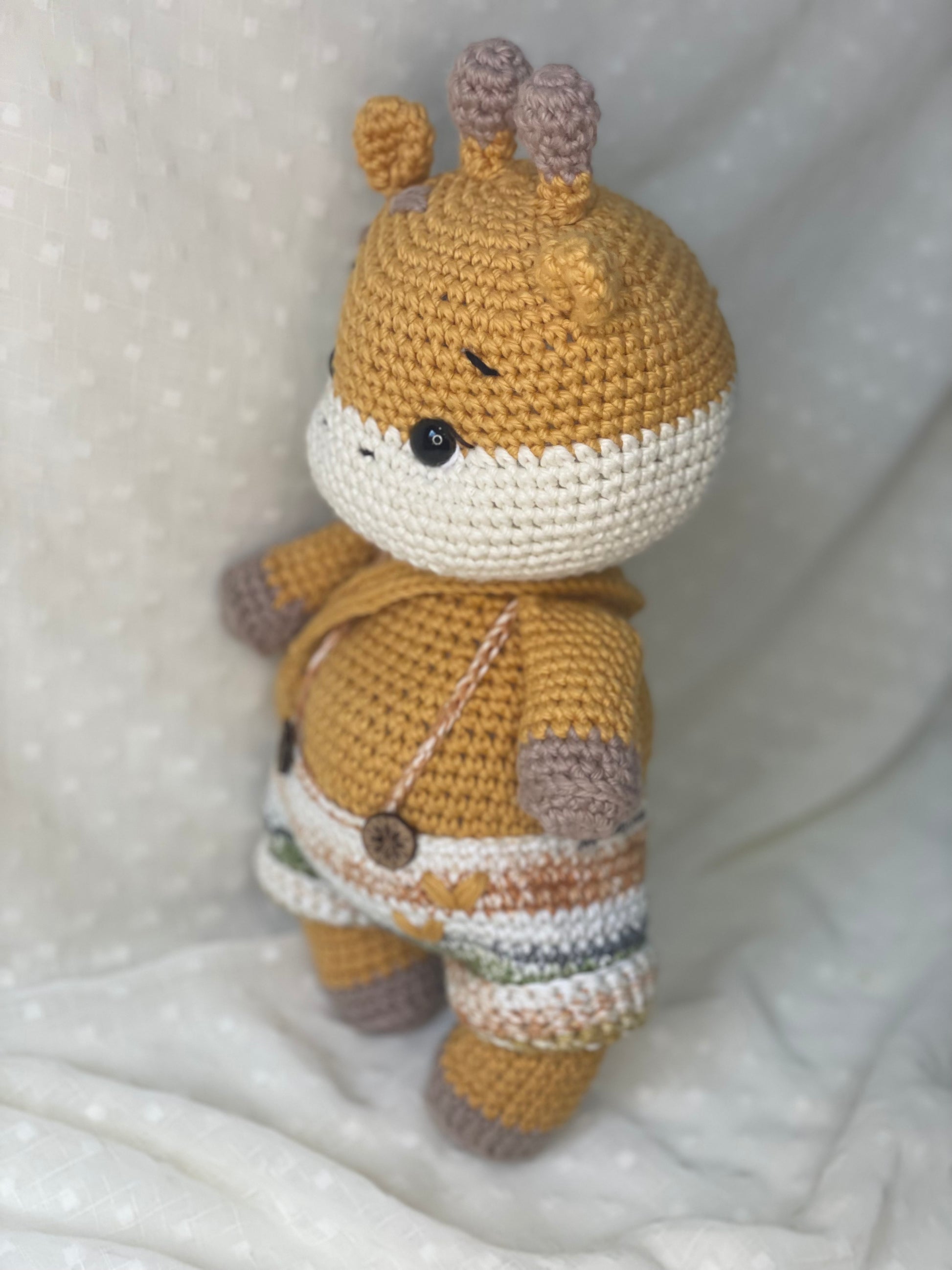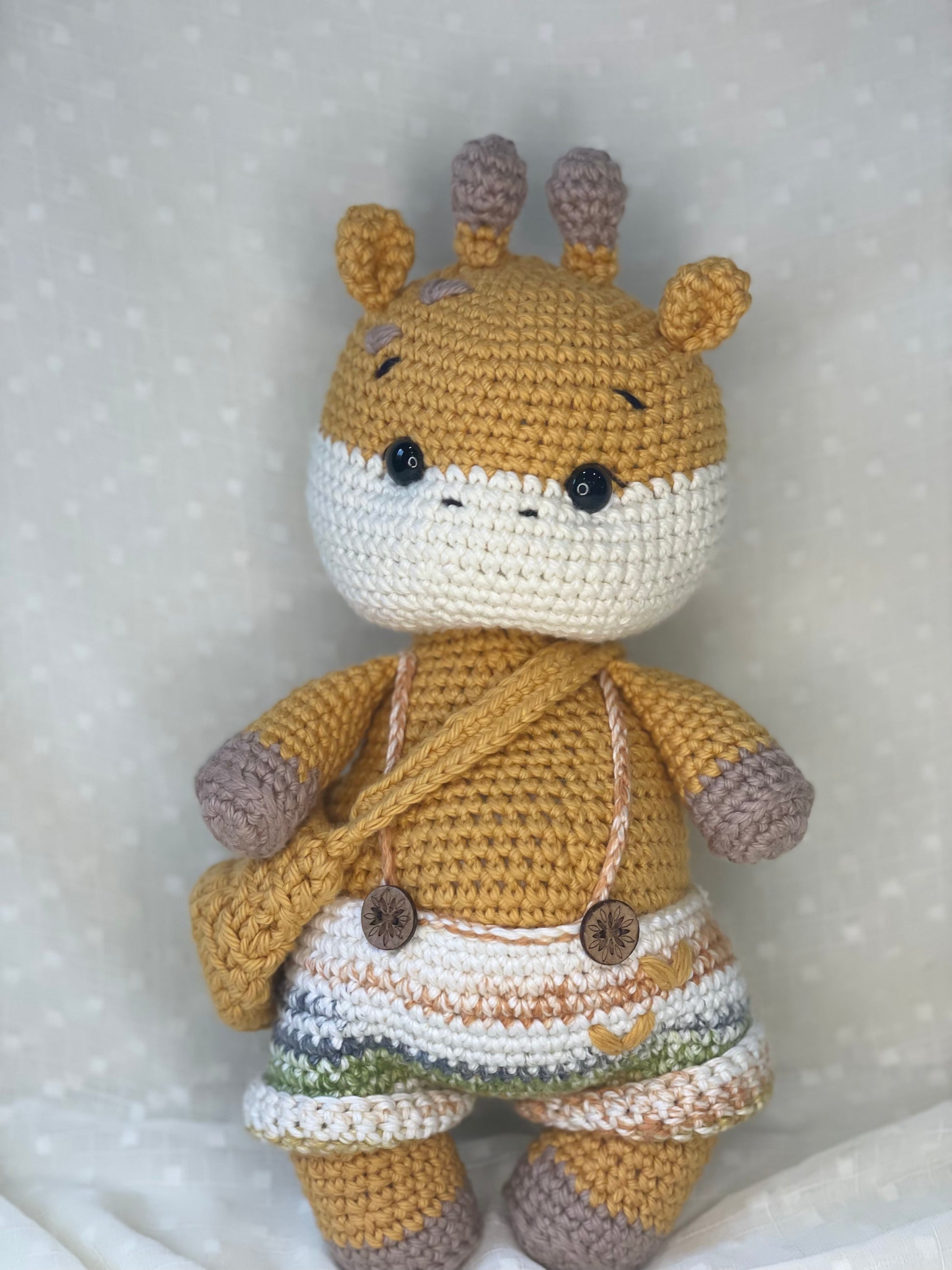 Gerald the Girraffe Meet your new best friend, Gerald the Giraffe! This plush companion comes with a satchel attached, making it perfect for carrying your little one's favorite treasures. Bring home Gerald today and experience endless hours of cuddly, imaginative play.